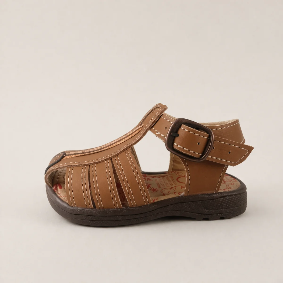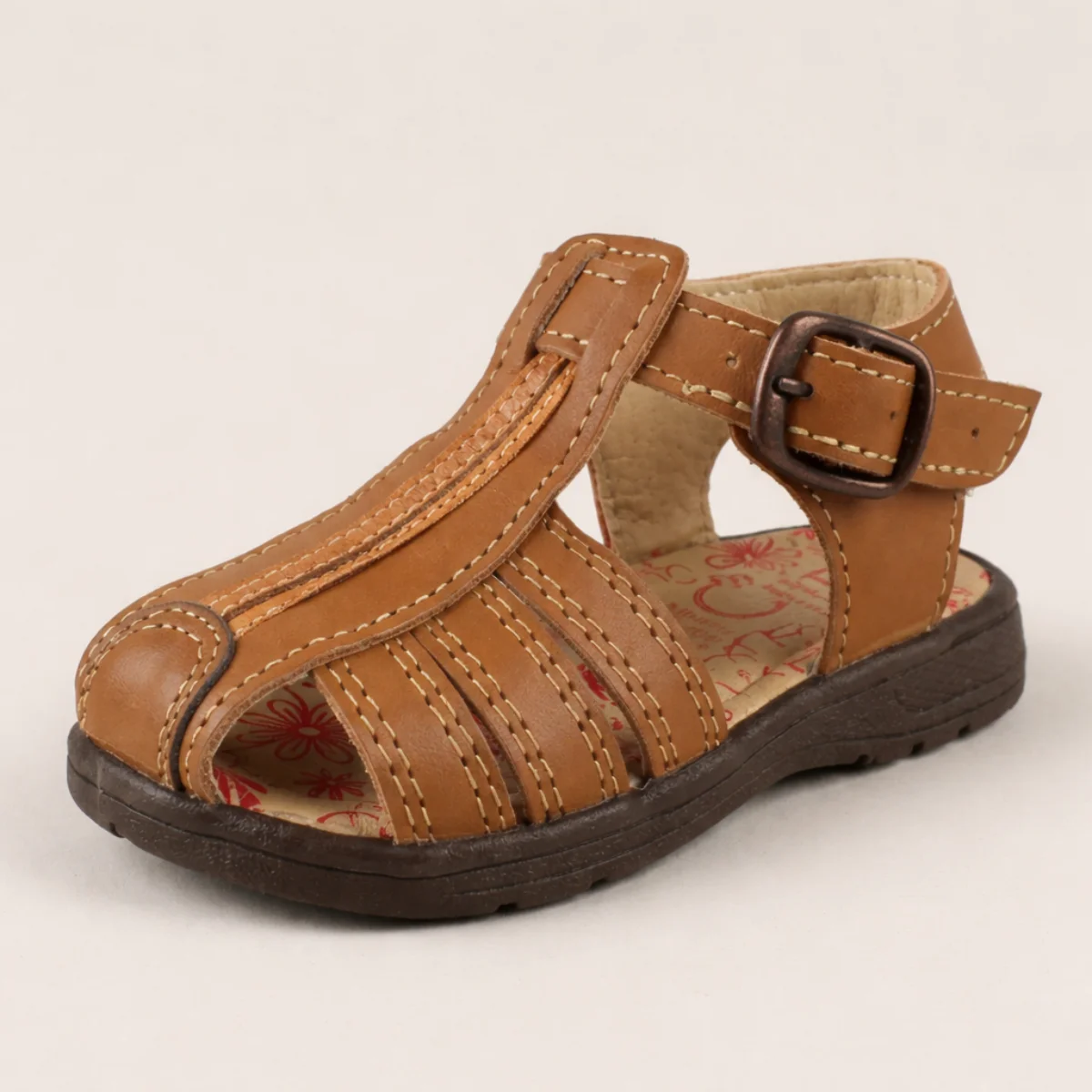 Huarache clásico para niño con diseño de punta protegida y ajuste de hebilla. Fabricado en material sintético duradero y fresco, perfecto para mantener los pies cómodos y protegidos en cualquier aventura diaria. Disponible en miel, marino y blanco.