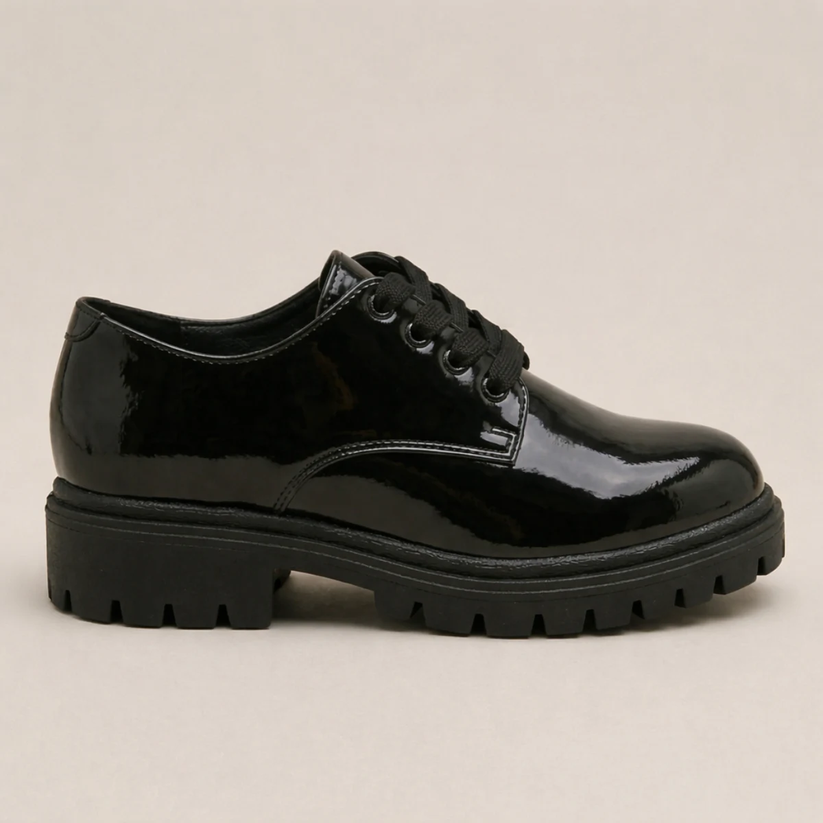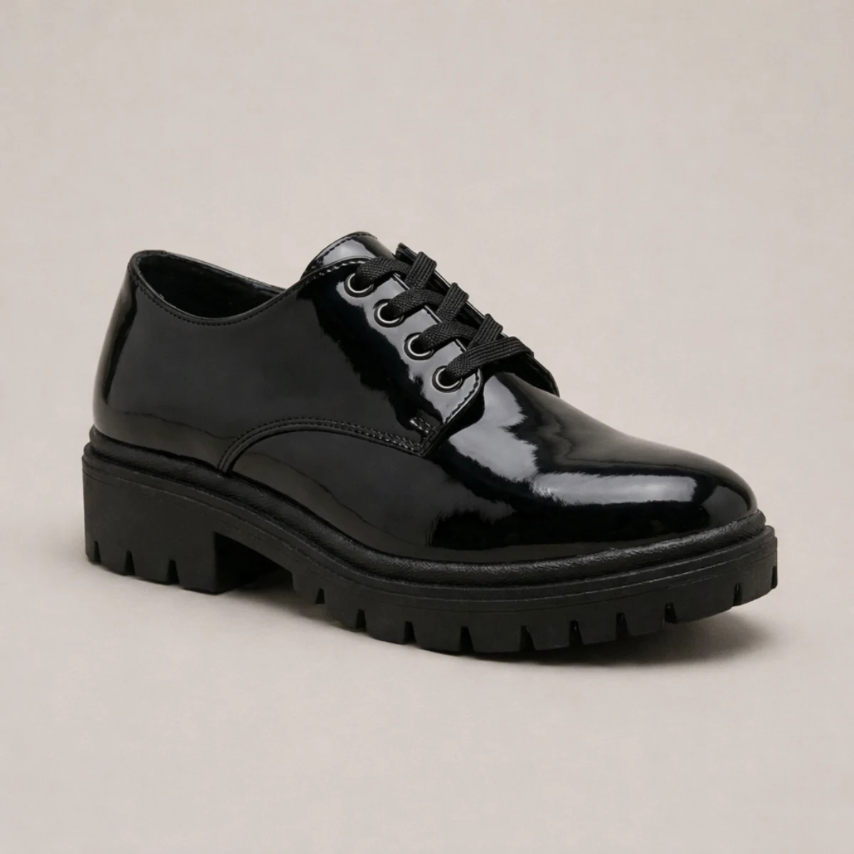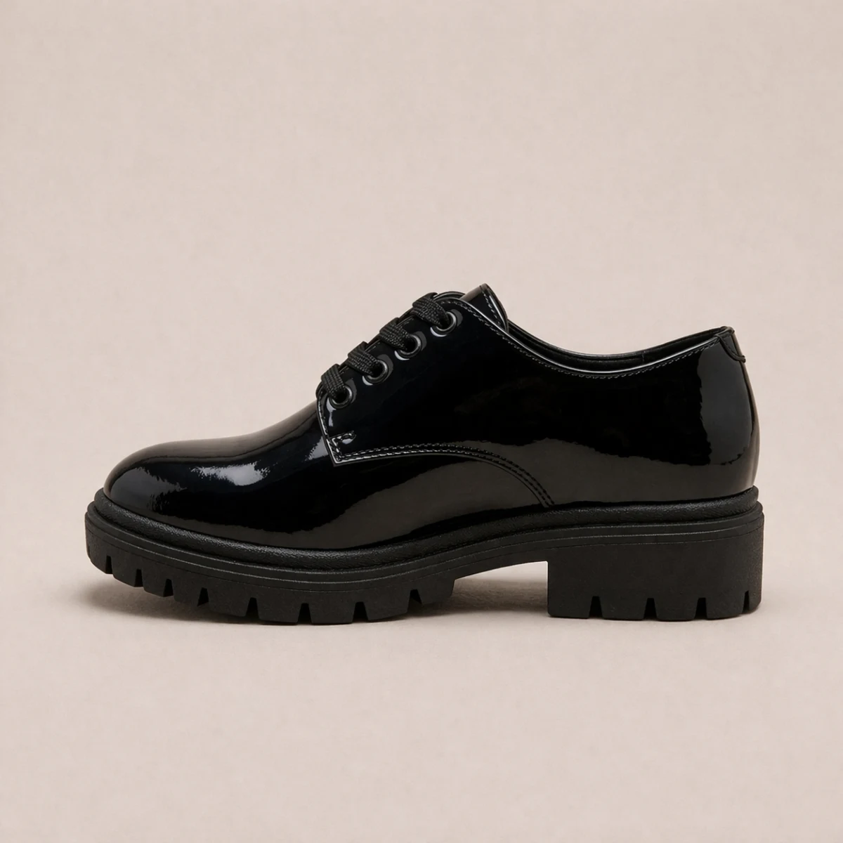 Elegante mocasín en charol negro brillante con suela de plataforma chunky y sofisticado herraje dorado. El calzado ideal para combinar resistencia, altura y un estilo premium que destaca tanto en looks formales como casuales.