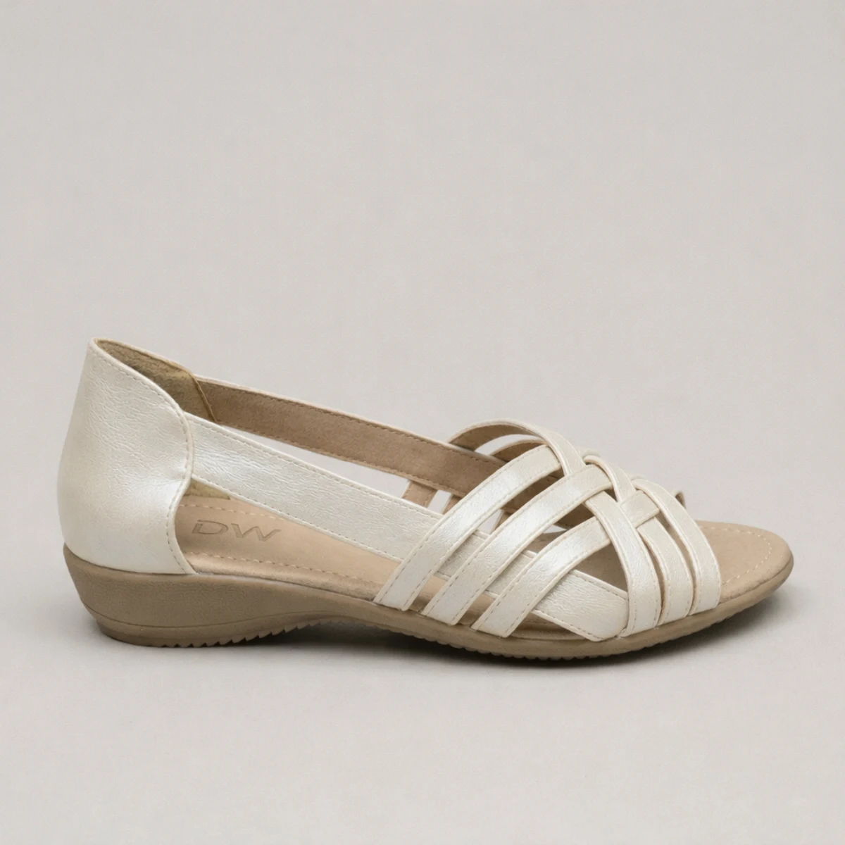 Sandalia de tacón bajo y cuadrado para dama con diseño de tiras cruzadas. Un modelo sintético ligero, fresco y muy estable, ideal para el uso diario en verano o eventos casuales. Disponible en blanco, negro y tabaco.