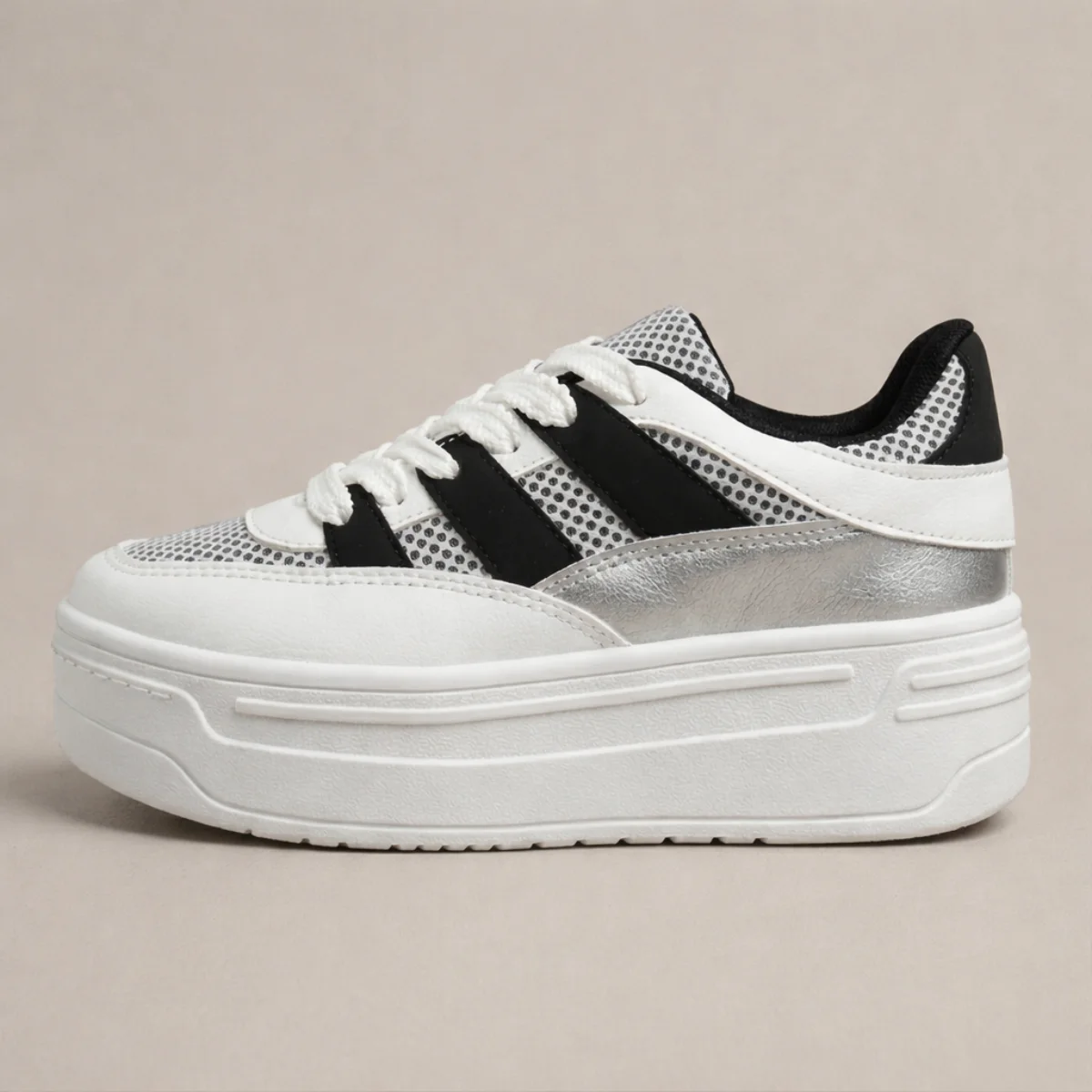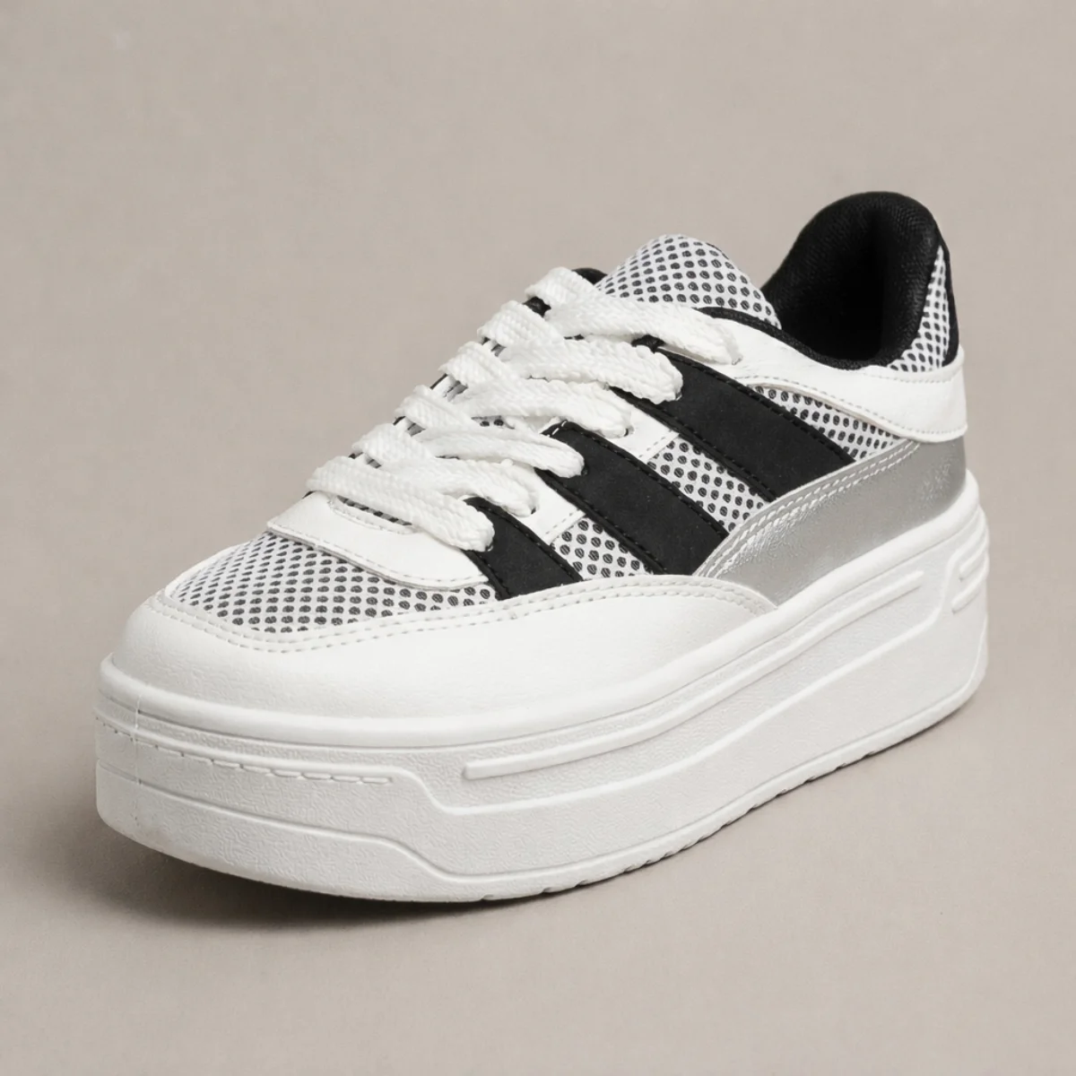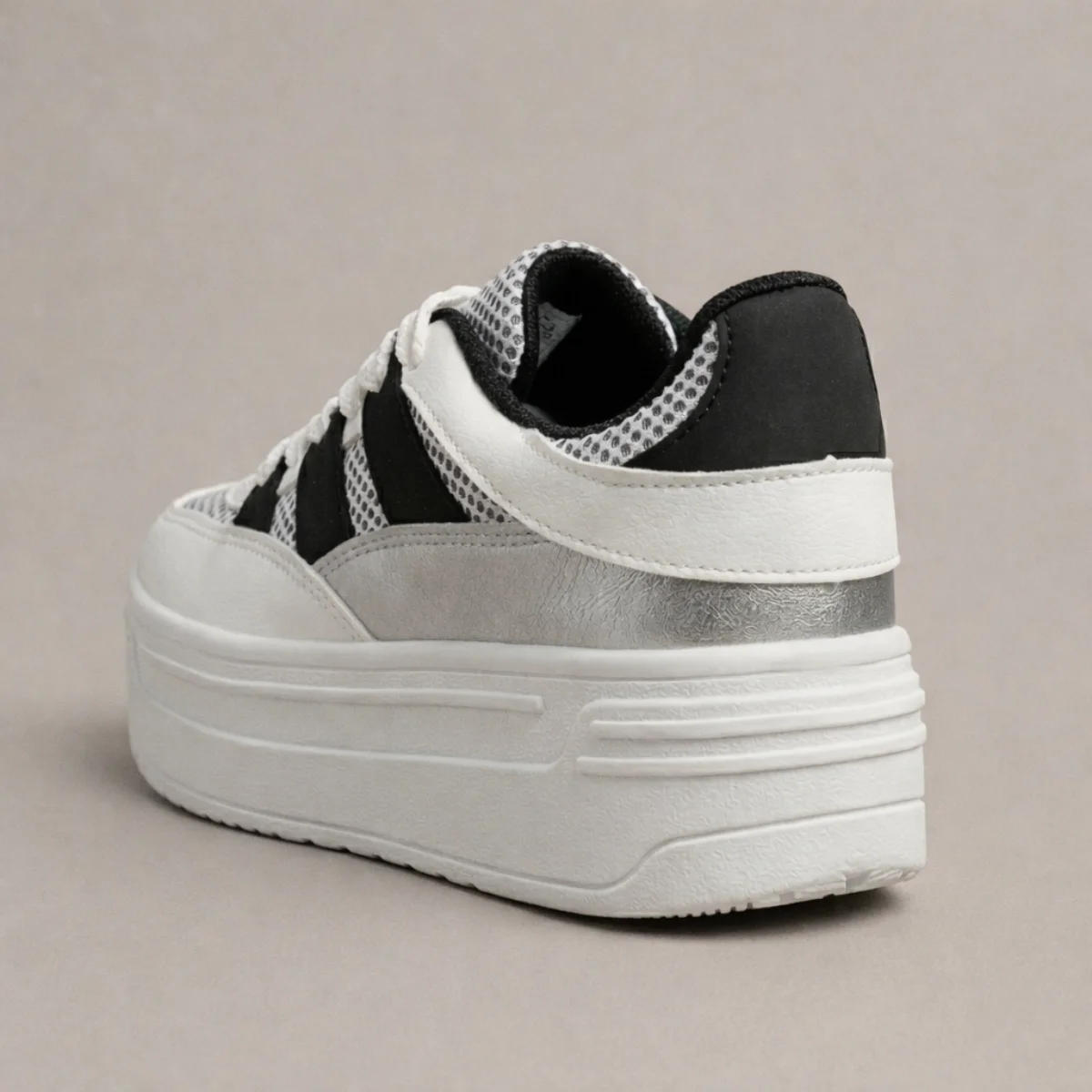Este tenis urbano destaca por su diseño moderno de suela alta tipo plataforma, ideal para quienes buscan estilo y altura sin sacrificar la comodidad. Fabricado íntegramente en material sintético liso y paneles de tela de superficie lisa, garantiza un acabado mate impecable y una limpieza sencilla. Su estructura sólida, libre de mallas y texturas porosas, ofrece un soporte firme para el día a día. El contraste entre la base blanca de la plataforma y los detalles de color en el talón y la lengüeta lo convierten en un calzado versátil que combina a la perfección con jeans, joggers o ropa casual urbana.