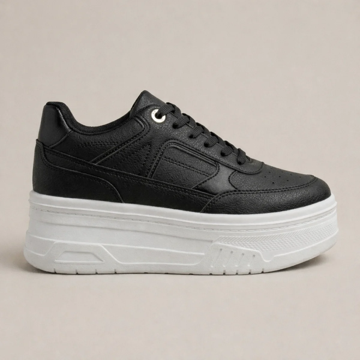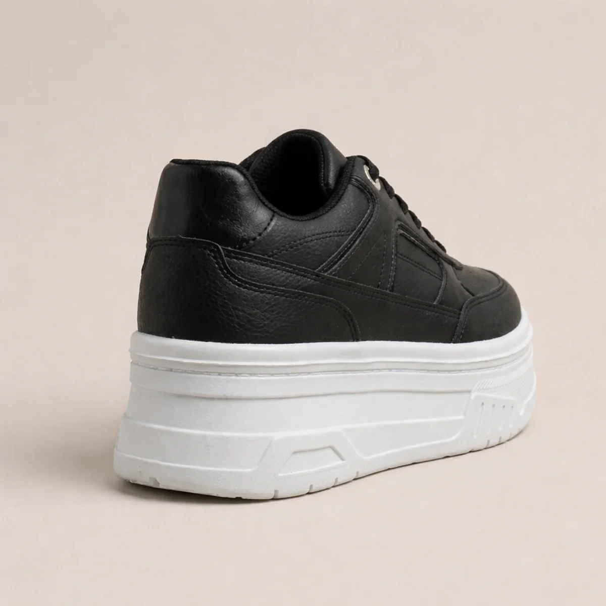 Este tenis urbano destaca por su diseño moderno de suela alta tipo plataforma, ideal para quienes buscan estilo y altura sin sacrificar la comodidad. Fabricado íntegramente en material sintético liso y paneles de tela de superficie lisa, garantiza un acabado mate impecable y una limpieza sencilla. Su estructura sólida, libre de mallas y texturas porosas, ofrece un soporte firme para el día a día. El contraste entre la base blanca de la plataforma y los detalles de color en el talón y la lengüeta lo convierten en un calzado versátil que combina a la perfección con jeans, joggers o ropa casual urbana.